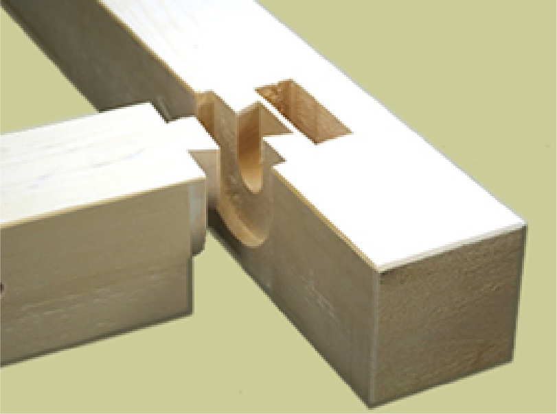 従来、大工職が柱・梁・桁を熟練した技で加工していましたが、現在ではコンピュータ機械加工(プレカット加工)により品質向上、合理化を図っています。