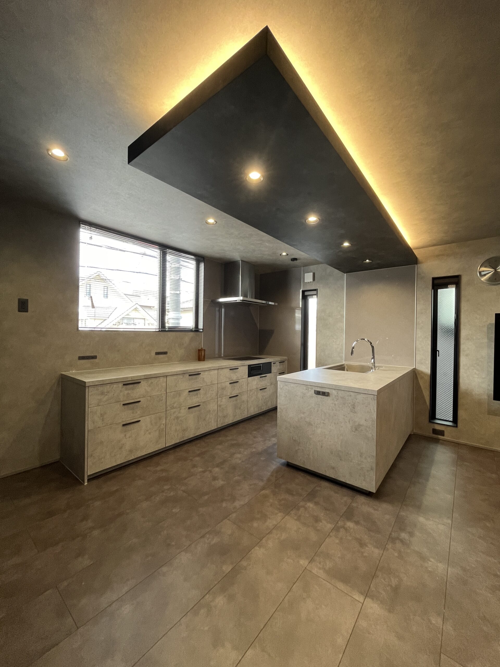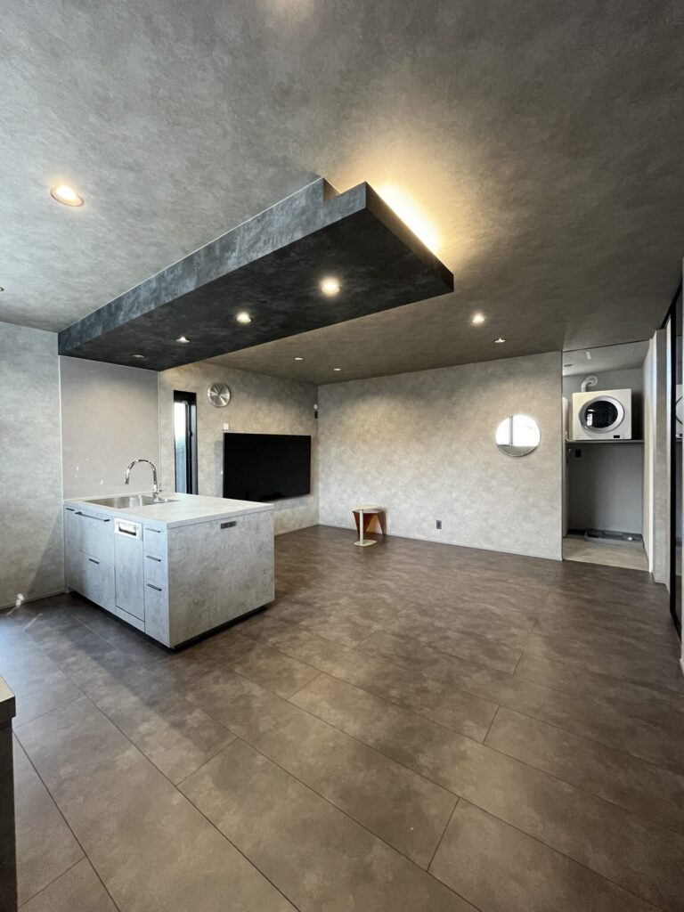 下がり天井と間接照明、グラフテクトの重厚感あるキッチンなどを採用し、