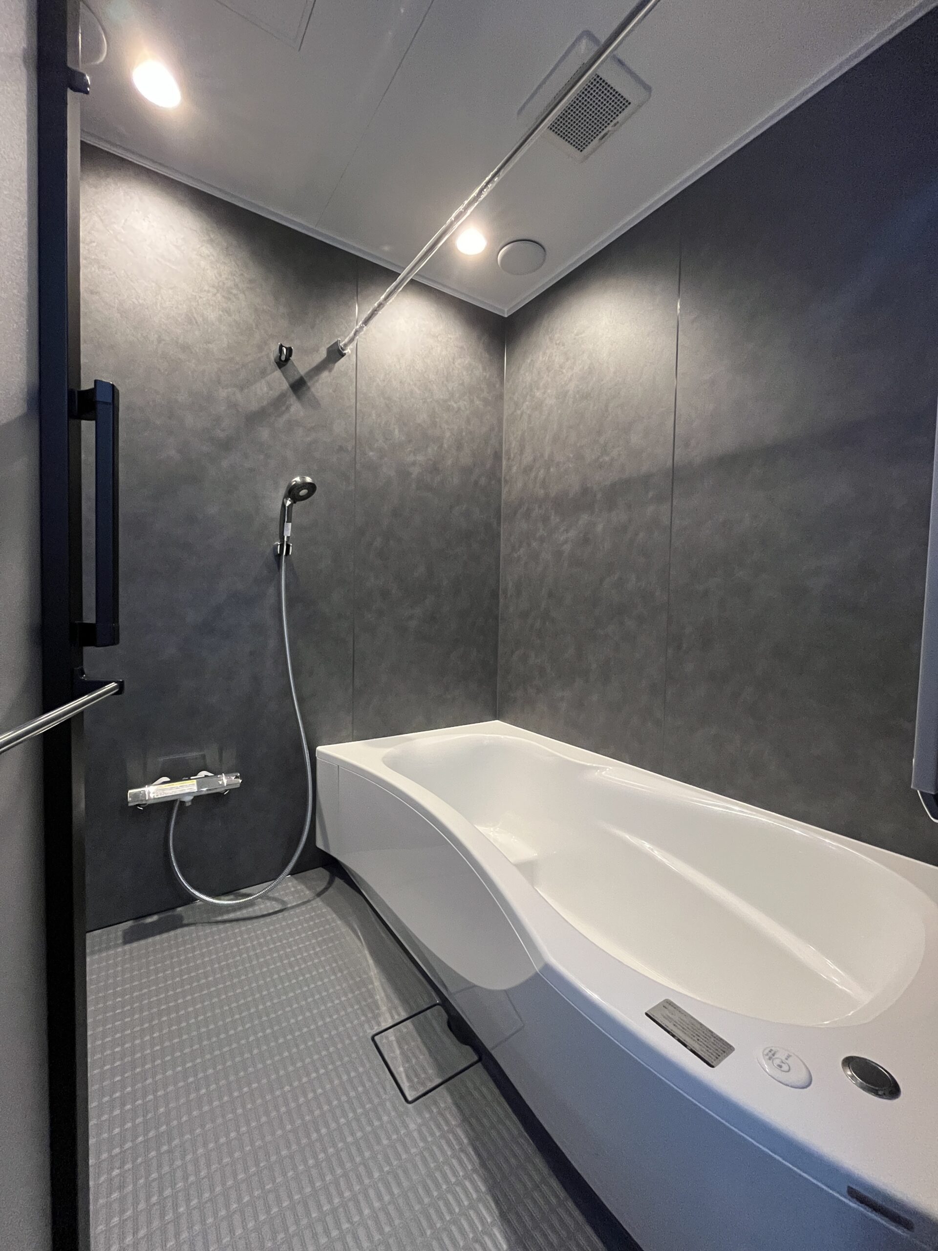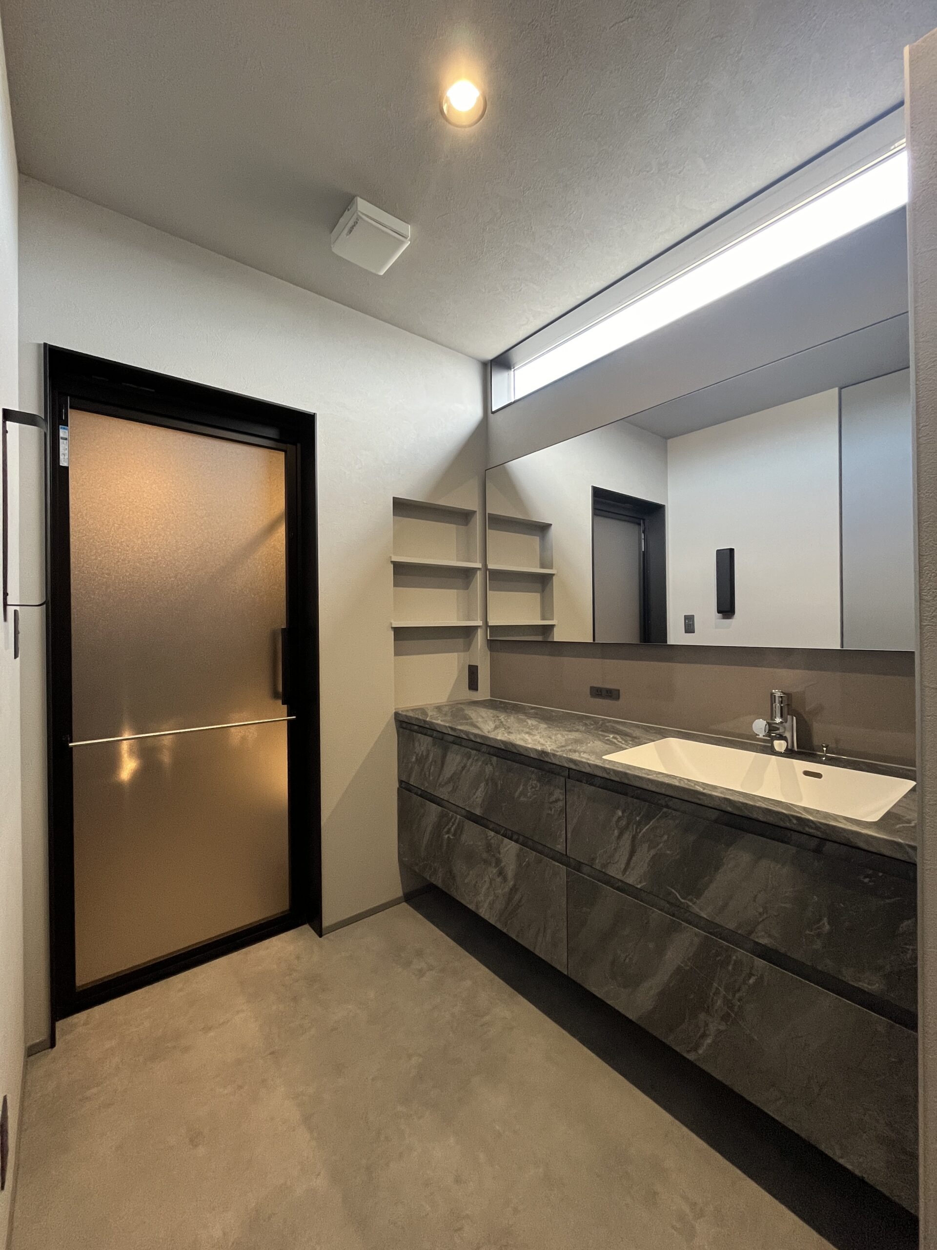 ユニットバスや洗面脱衣室もグレーの石目調で統一し、ホテルのような高級感を味わえる空間に仕上がりました。