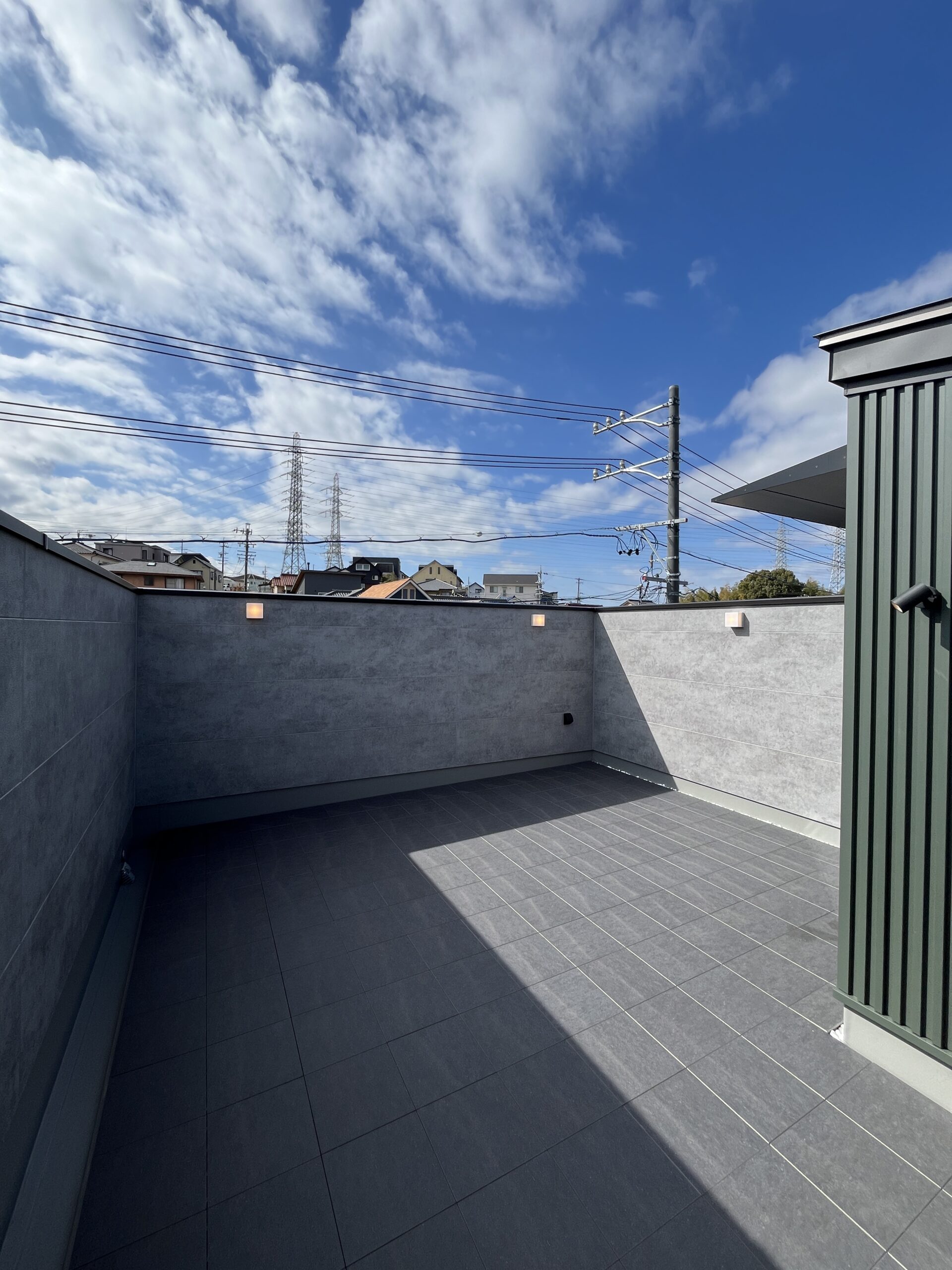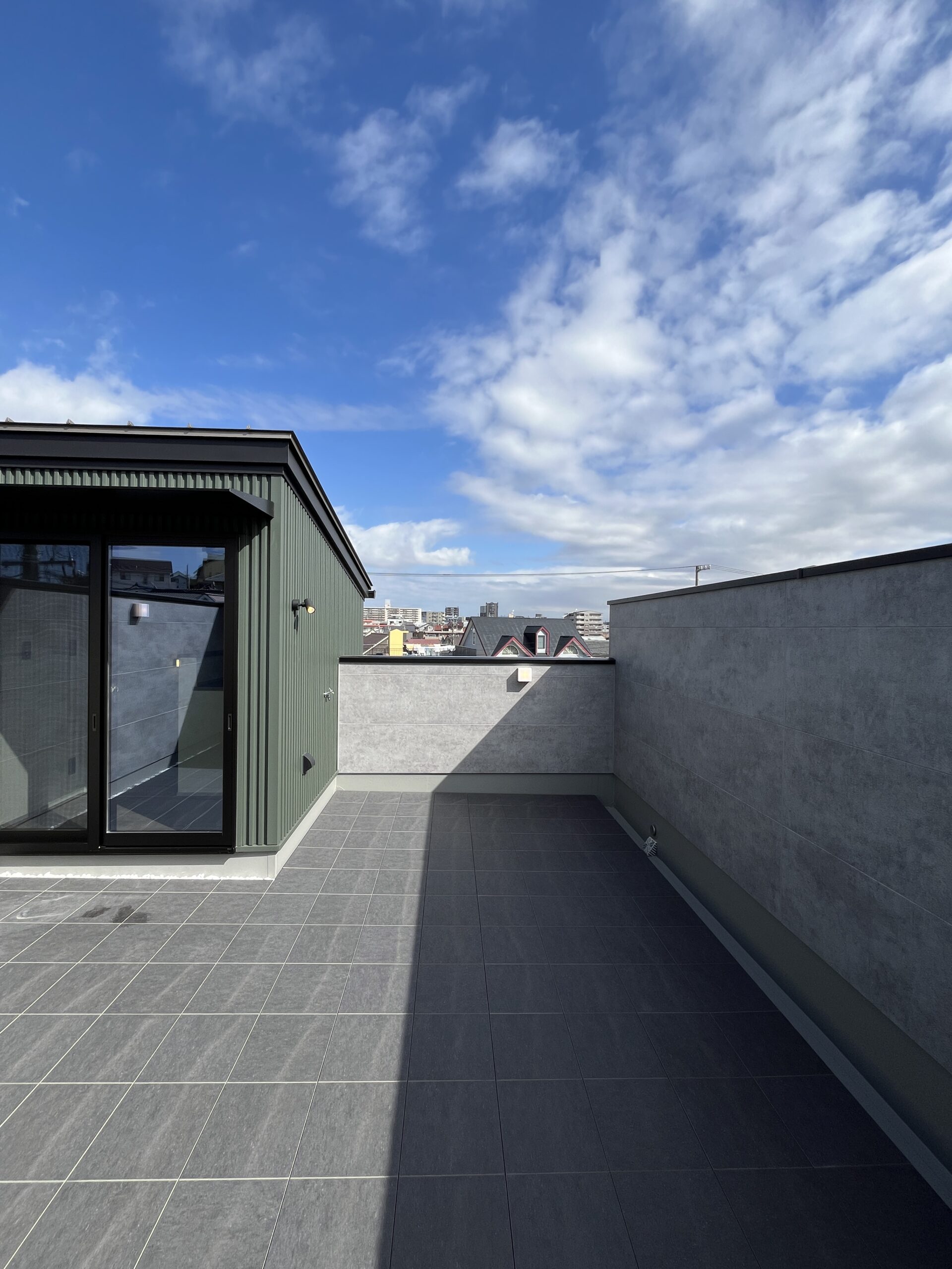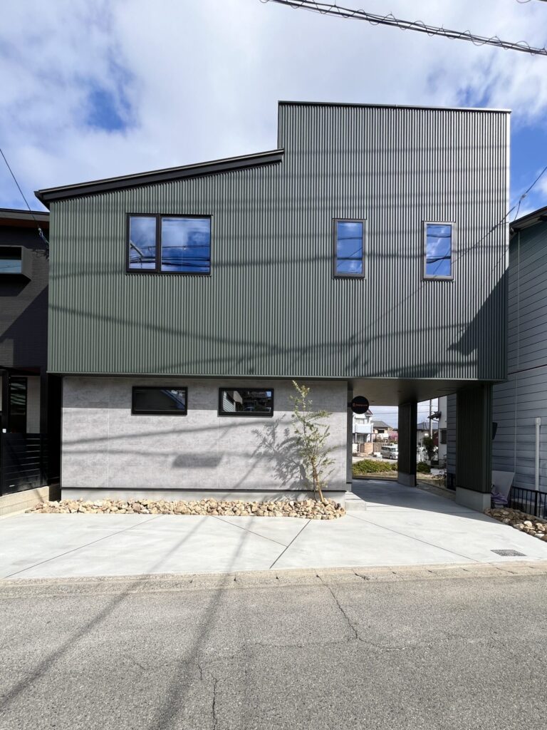 深みのあるモスグリーンのガルバリウムにコンクリート調サイディングで仕上げた外壁は、