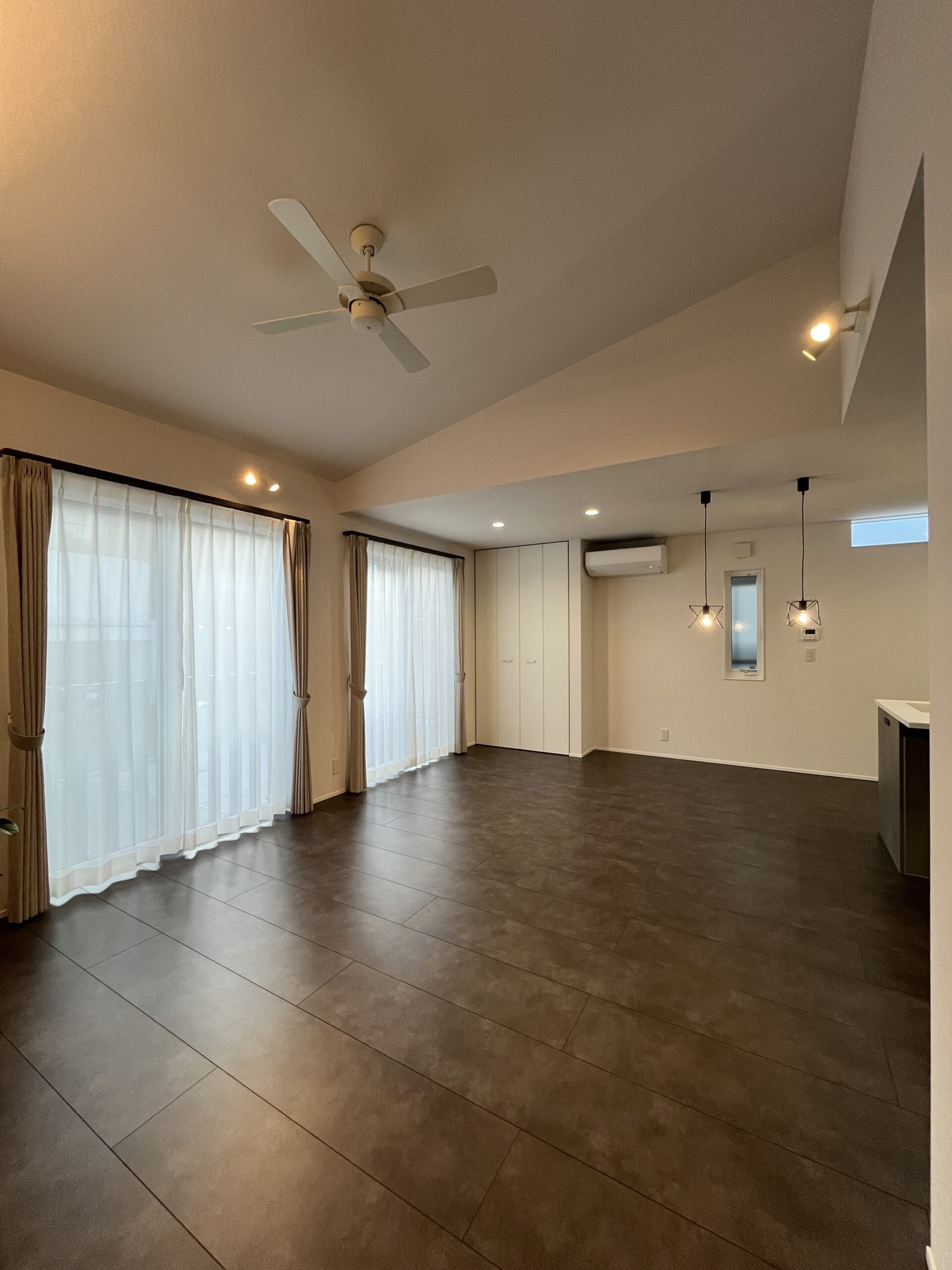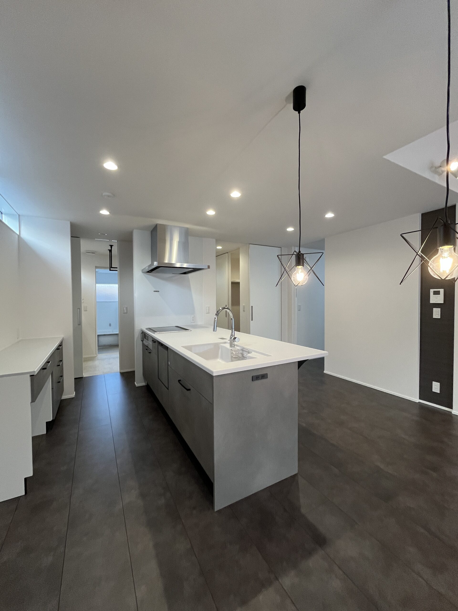 ダークコンクリート調のモダンな床材、グレーのキッチンやアクセントクロスでホテルライクな大人空間に仕上げました。