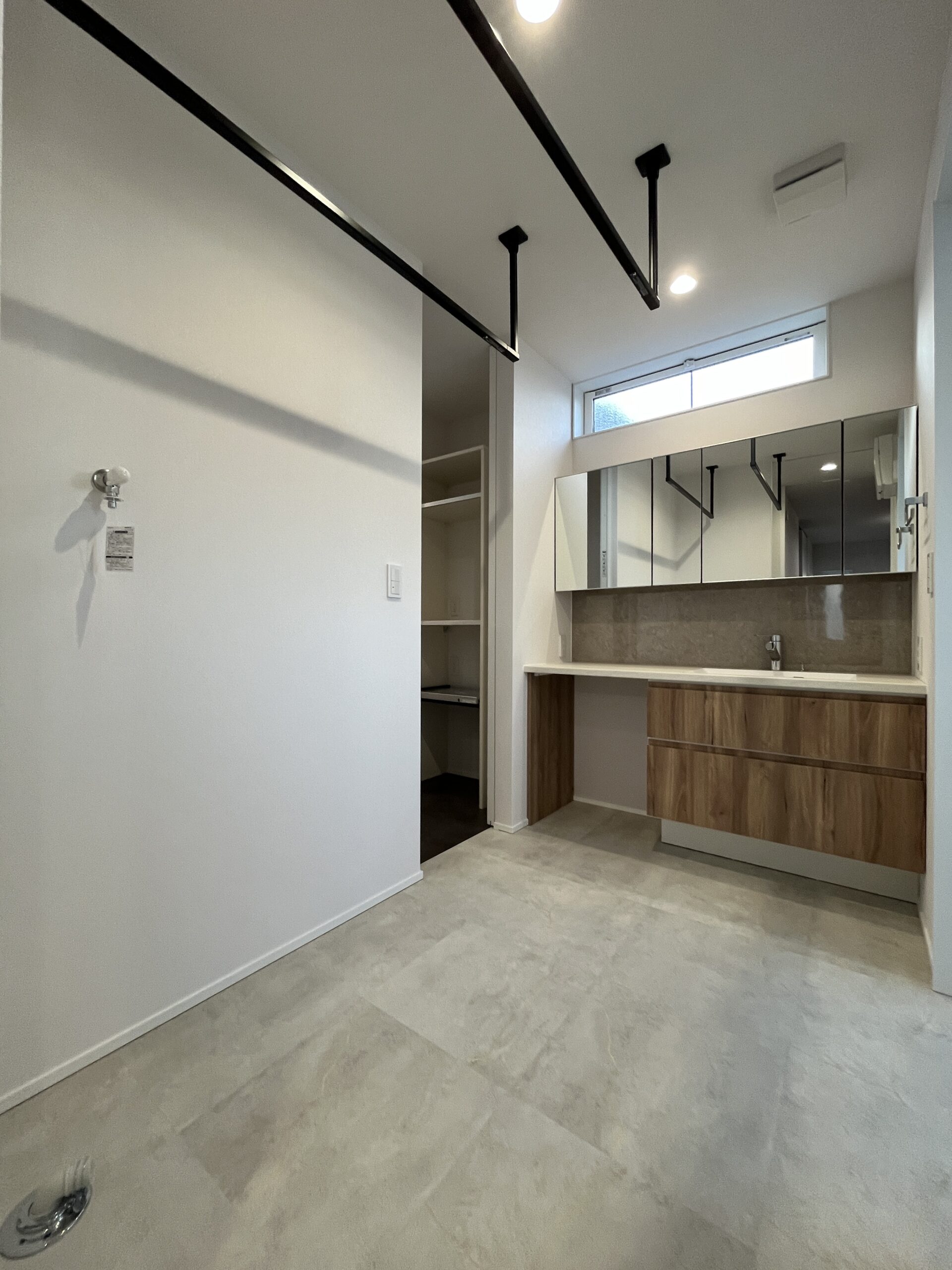 洗面脱衣室には洗濯機から出してすぐ干せるように物干しを設けました。