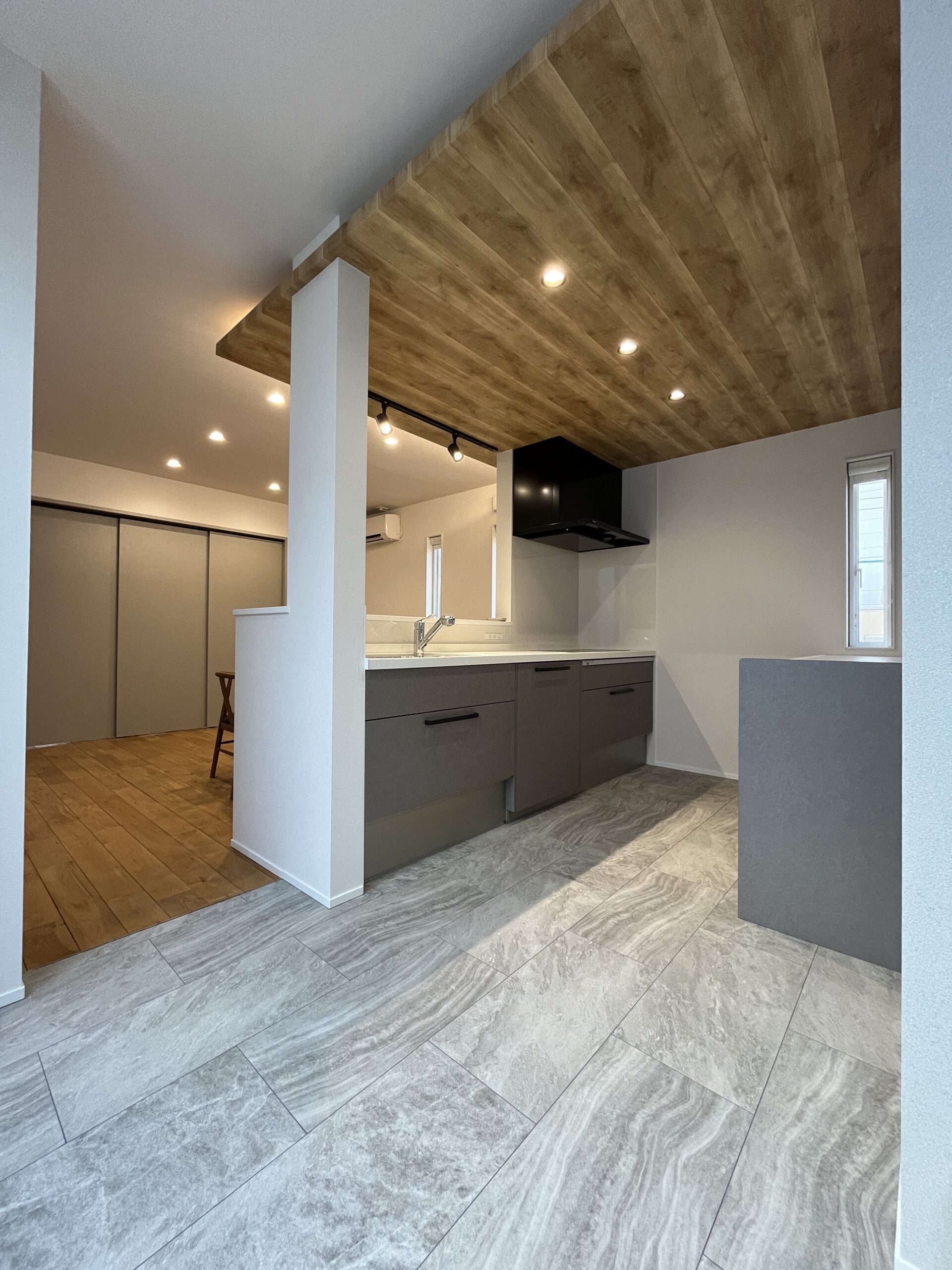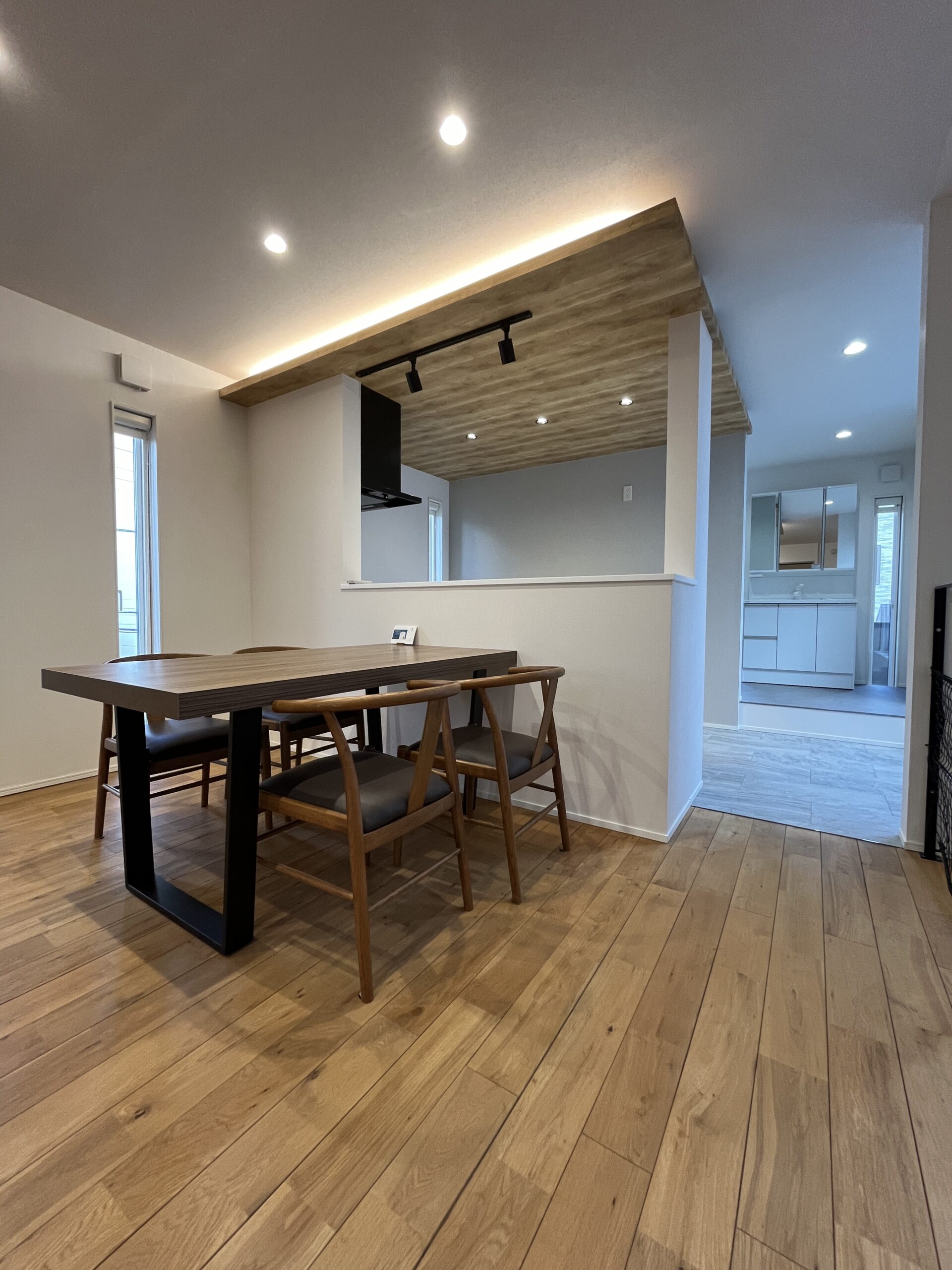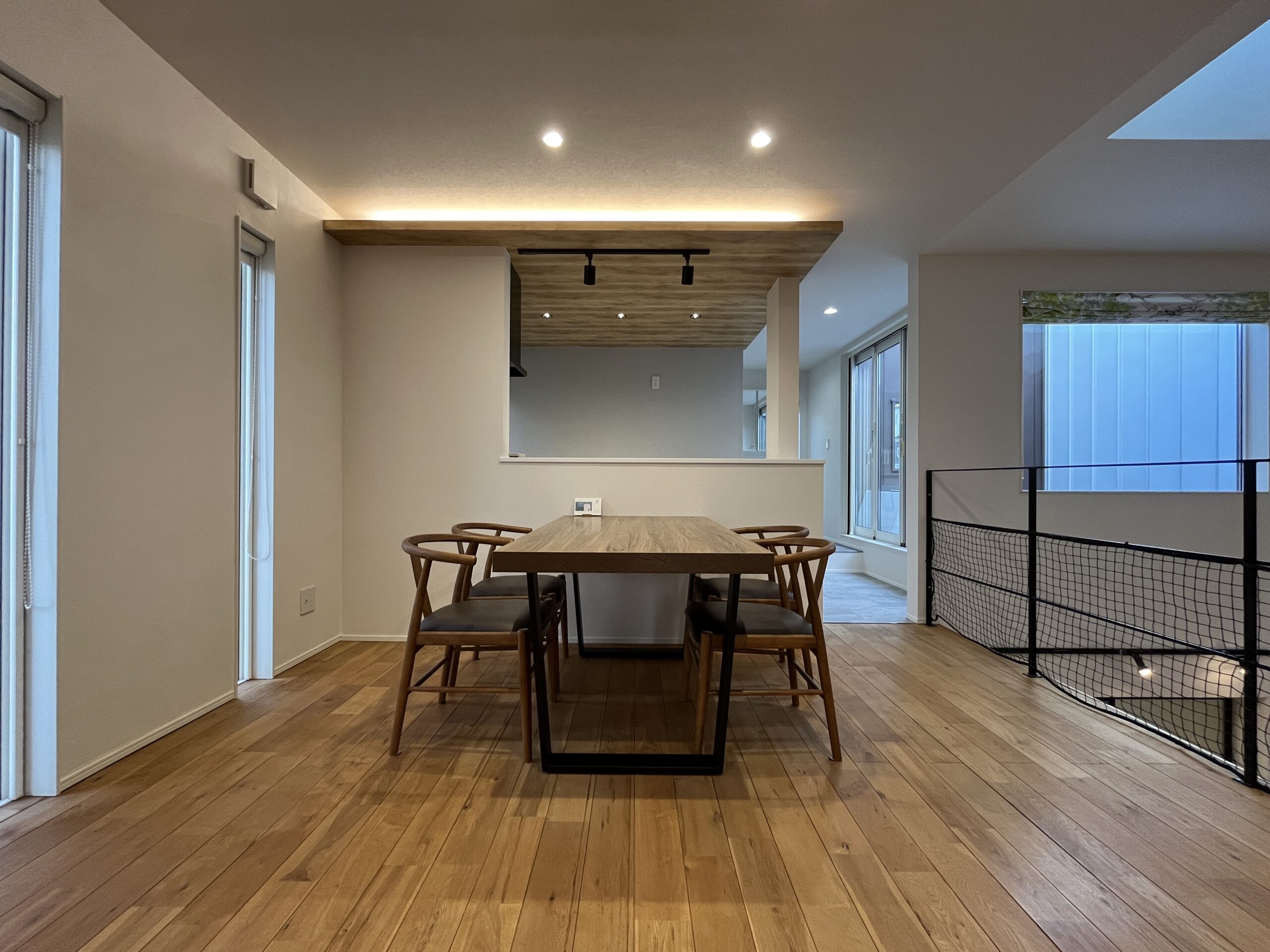 一歩足を踏み入れると、開放感あふれる大きな吹き抜け空間が広がります。床には無垢材、壁には漆喰を使用し、自然素材のぬくもりを感じていただけます。