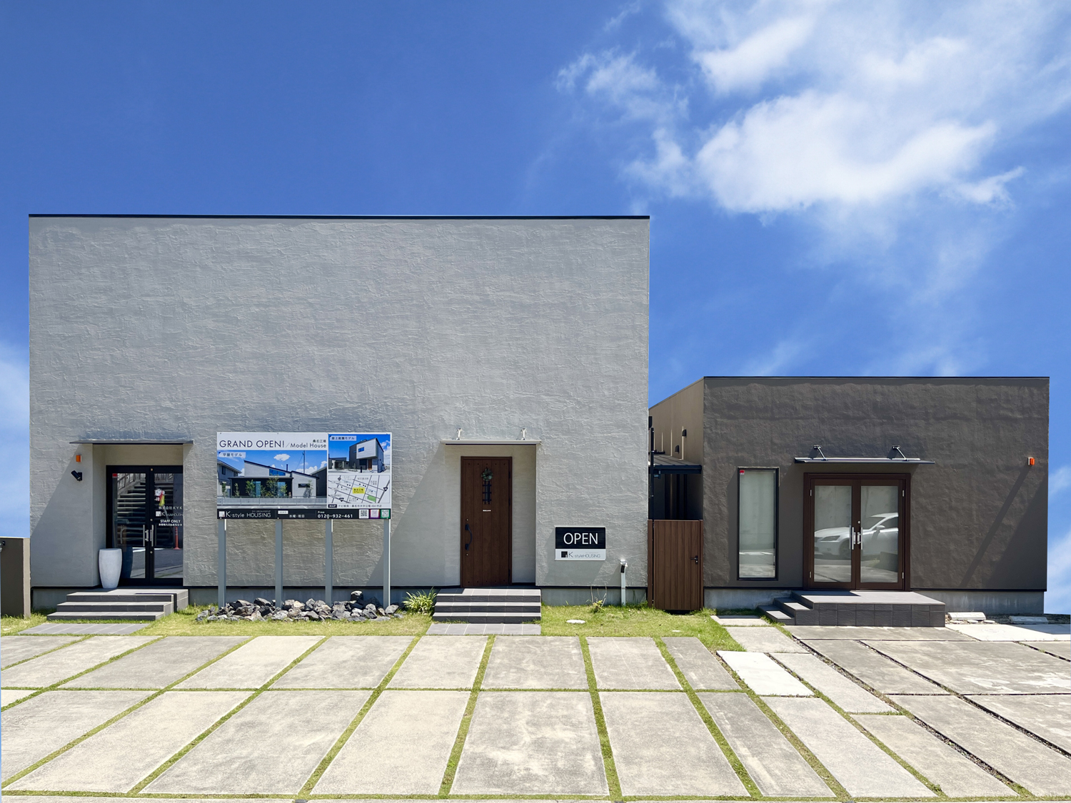 スクエア型のグレーの塗り壁が印象的な、モダンな外観。
