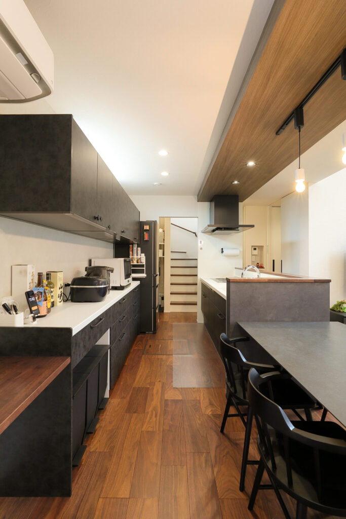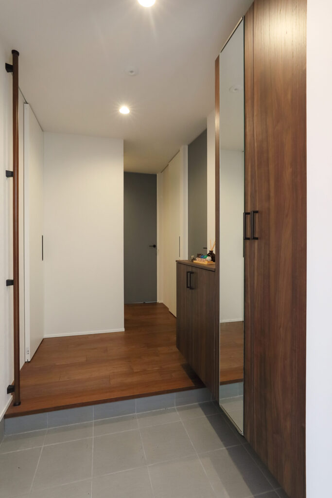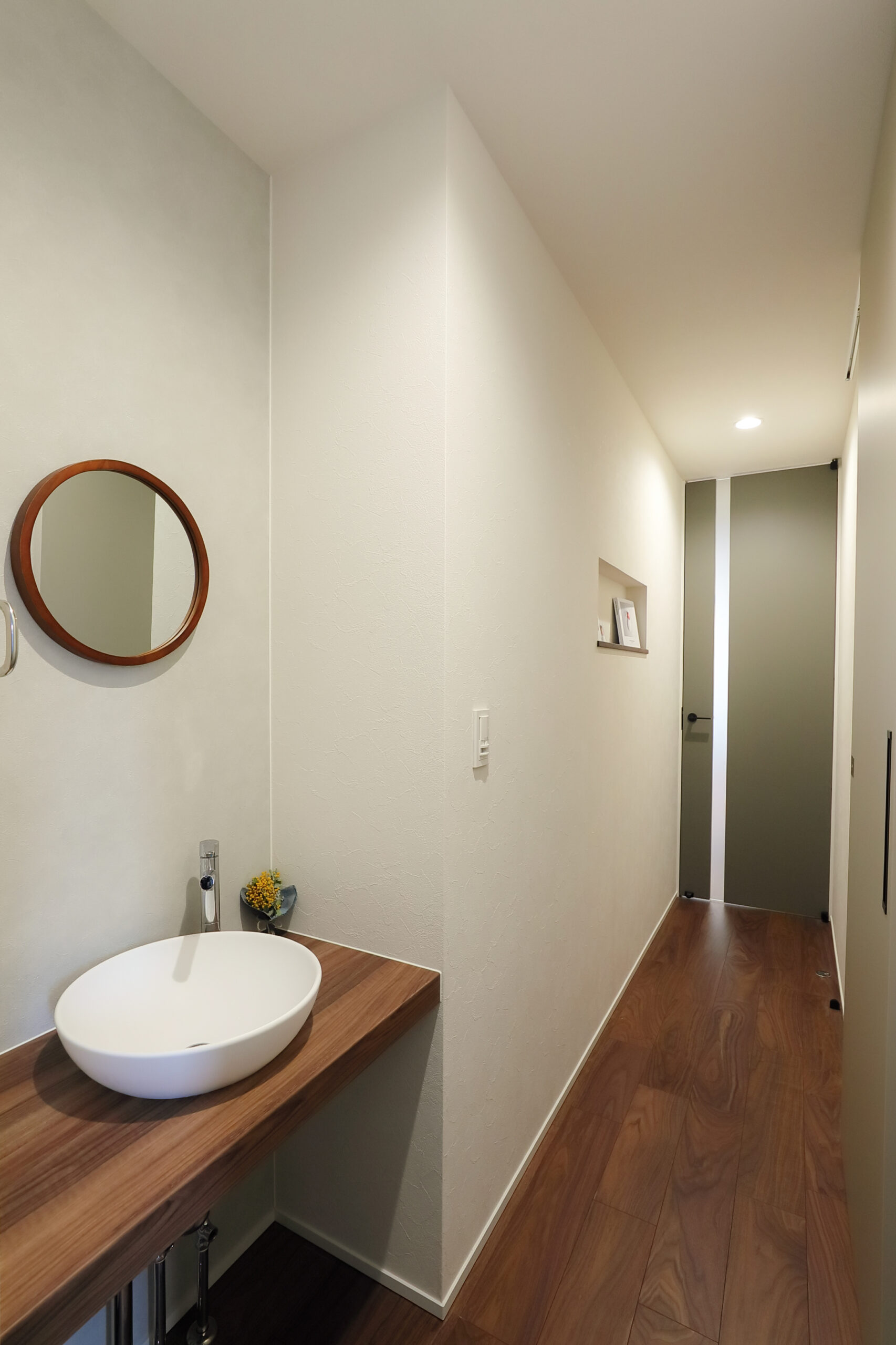 ホーム建築事例研ぎ澄まされた漆喰の白と深みのあるウォルナット。光と自然素材に包まれる豊かな日常。