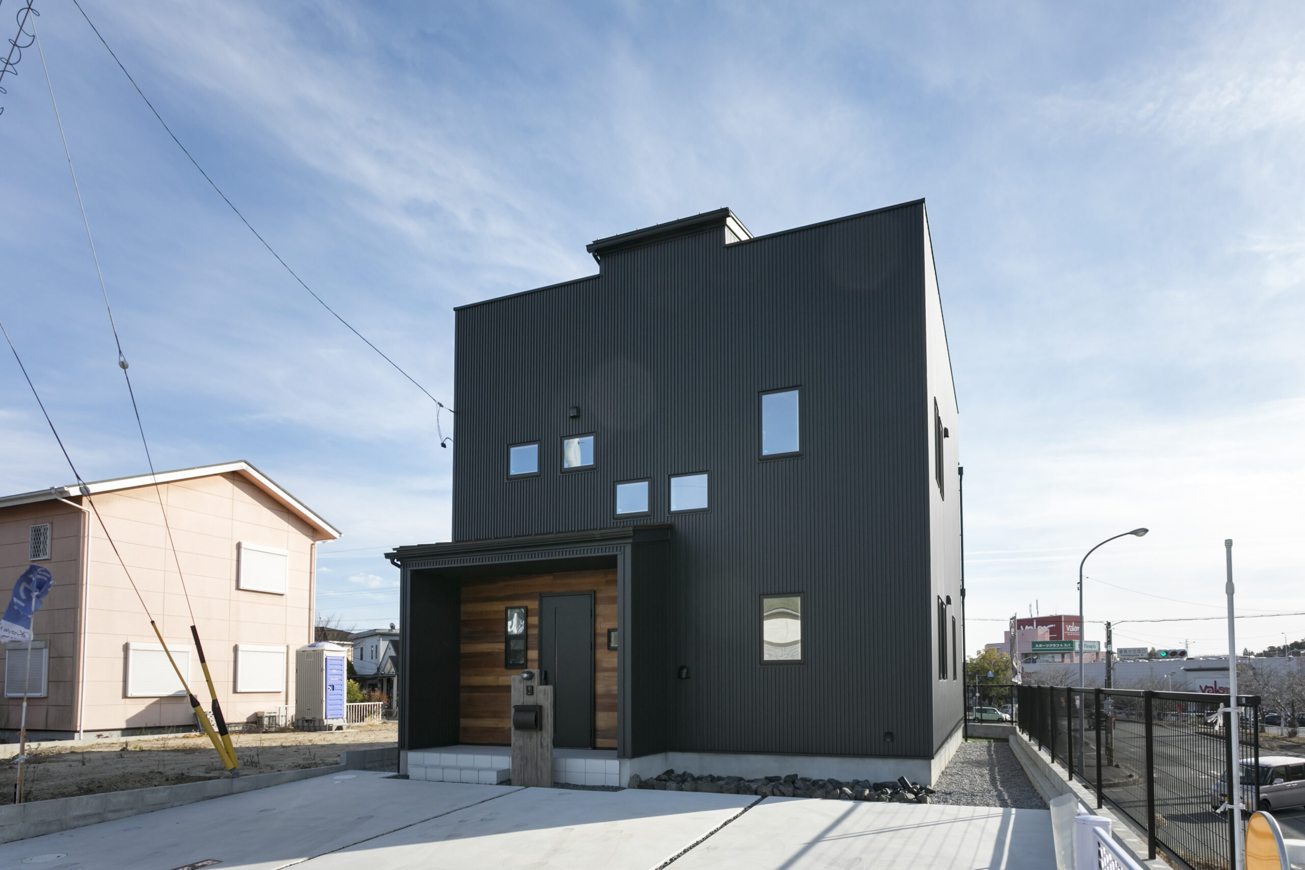 ブラックのガルバリウムと無垢材が織りなす、モダンな四角い家。